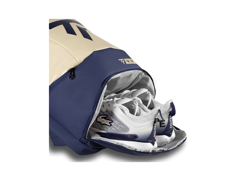 Z hlediska designu představuje taška klasickou kombinaci Team Tecnifibre – elegantní moderní béžový základ doplněný námořnickou modří, což vytváří tradiční tenisový vzhled a harmonii se sezonním oblečením. Části, které přicházejí do kontaktu se zemí, jsou v modré barvě, aby odolaly opotřebení.